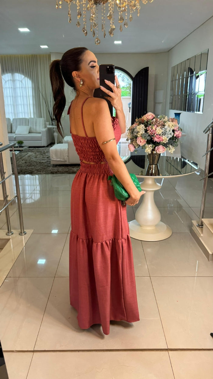 O Conjunto Lelis combina sofisticação e conforto em um visual encantador. Feito em tecido Duna, é composto por uma saia com elástico na parte de trás e uma elegante fenda frontal, além de um cropped com bojo que oferece sustentação e caimento perfeito. Uma peça que veste super bem e é ideal para diversas ocasiões.