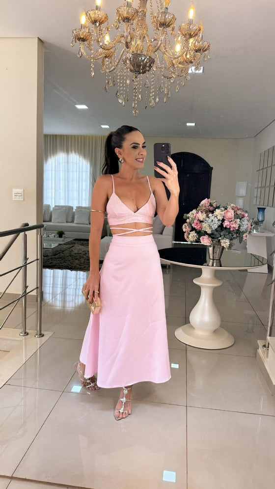 O Conjunto Marijane é um sonho de delicadeza e estilo. Composto por duas peças, traz uma saia midi elegante e um cropped com bojo, todo bordado, com um charmoso detalhe de amarração. Com um caimento impecável, esse conjunto veste super bem e é perfeito para diversas ocasiões.