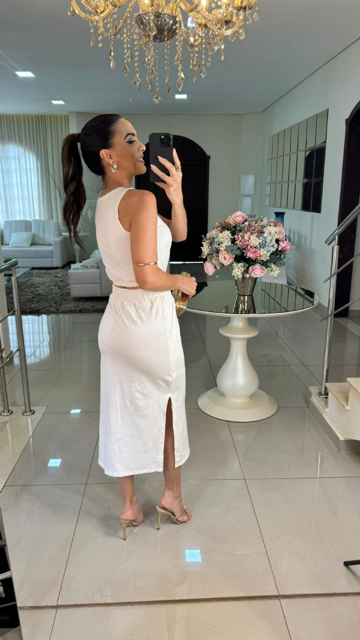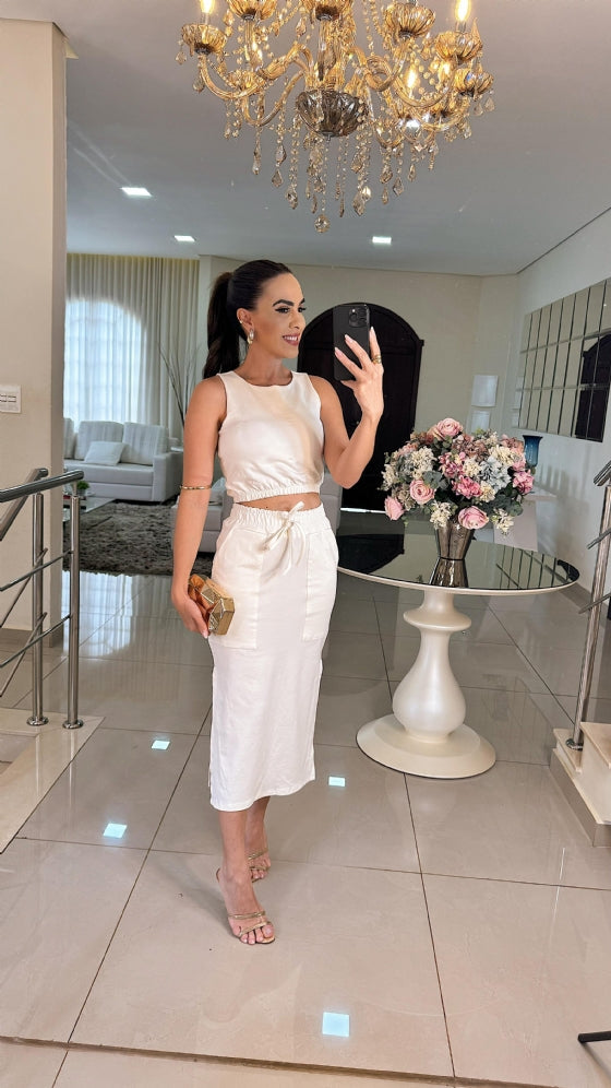 O Conjunto Natacha é sinônimo de estilo e versatilidade. Composto por duas peças, apresenta um cropped com elástico que garante conforto e ajuste perfeito, e uma saia midi com detalhe de elástico na cintura, fenda lateral e bolsos funcionais. Confeccionado em tecido moletinho, é leve e ideal para compor looks modernos e despojados.